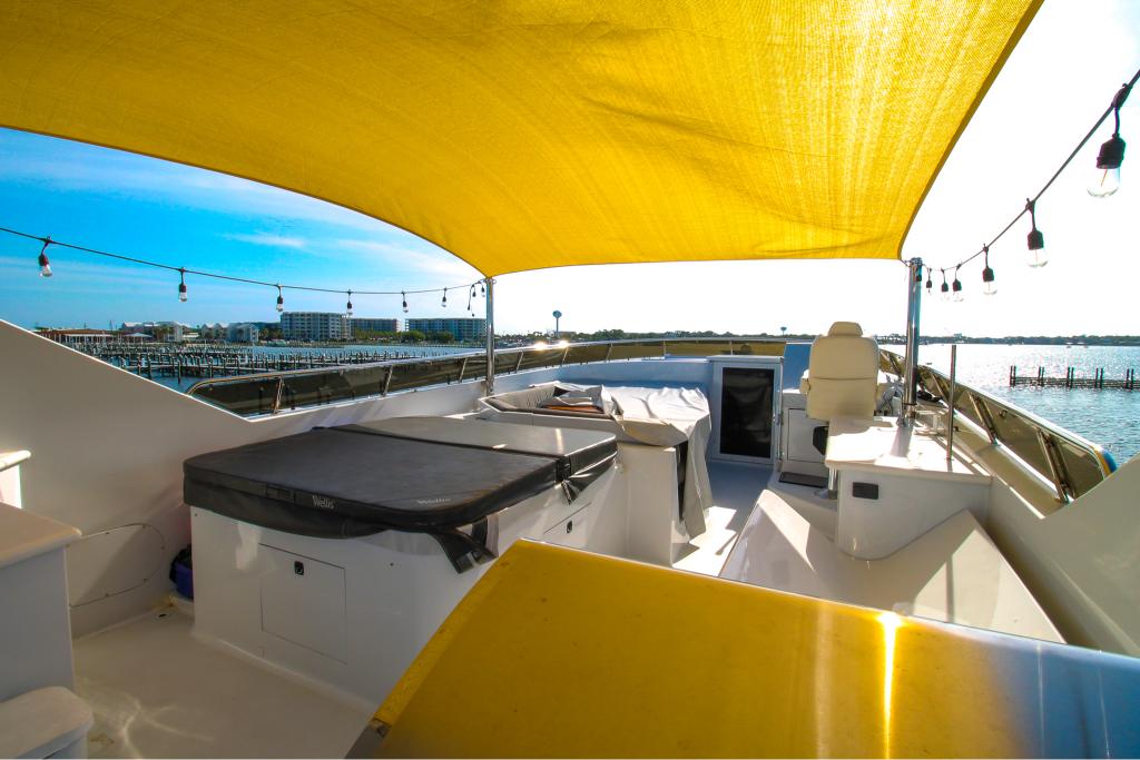 Ready II Play can fit up to 12 guests and the charterer, giving everyone plenty of room to relax, spread out, and explore. You will immediately see why she is the best yacht tour on the Emerald Coast. Whether you're relaxing on the sun deck with a glass of champagne, taking a bath in the hot tub on board, or watching dolphins dance in the wake from the main salon, you will see why she is the best.